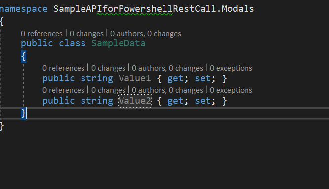 Add Sample properties to the class. I created Value1 and Value2 as string type.
